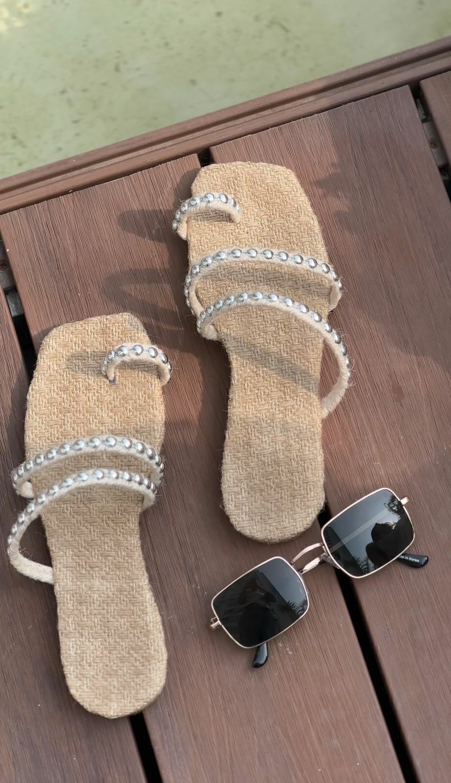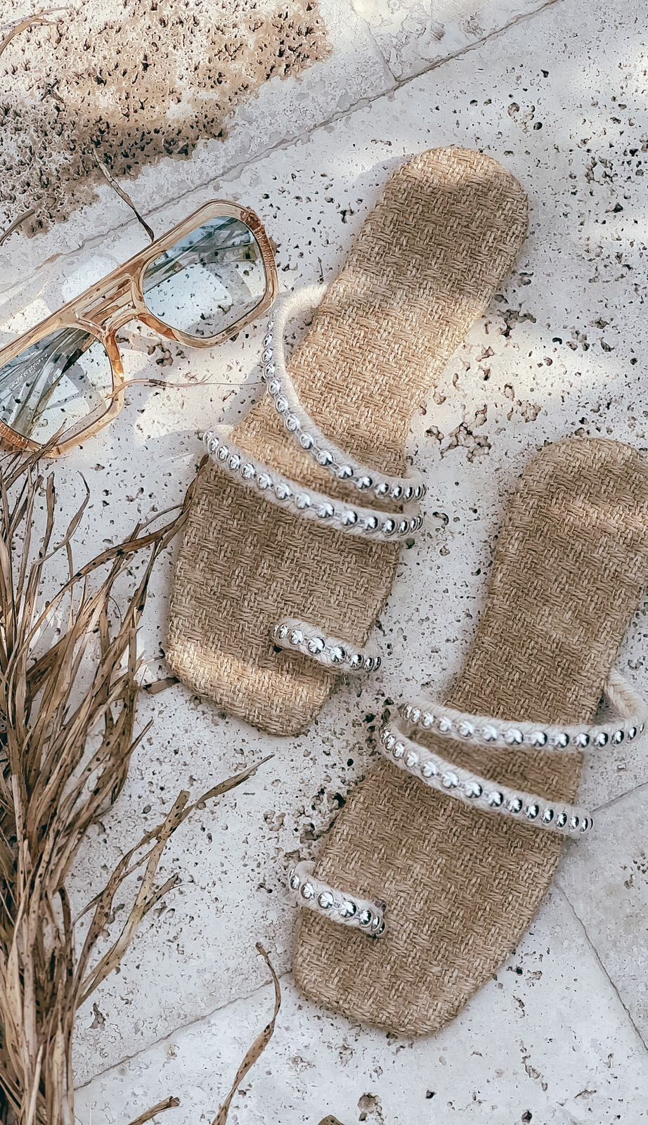 Material: Yute, con tiras de yute y tachas en color plateado.